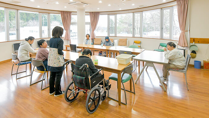 美里学園に入所する方に日中の場を提供し、さまざまな活動を支援しています。障がいの特性や能力に応じた作業に取り組めるよう3つの班に分かれ、ウォーキング、ストレッチ体操、手芸などの日中活動を楽しんでいただきます。居住の場と日中作業の場を分けた活動により気持ちにメリハリが生まれ、生活のリズムが整います。