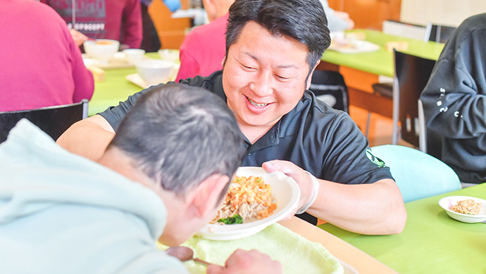 重度の障がいを持つ方を中心に、安定した日常生活が送れる居住の場を提供しています。利用者様の体調に合わせた食事の提供、入浴や排せつの介助、歯磨きや服薬のお手伝いなど、さまざまな側面から一人ひとりに適切なサポートを行います。職員の交代勤務による24時間の支援体制で、利用者様が就寝中の夜間も見守ります。